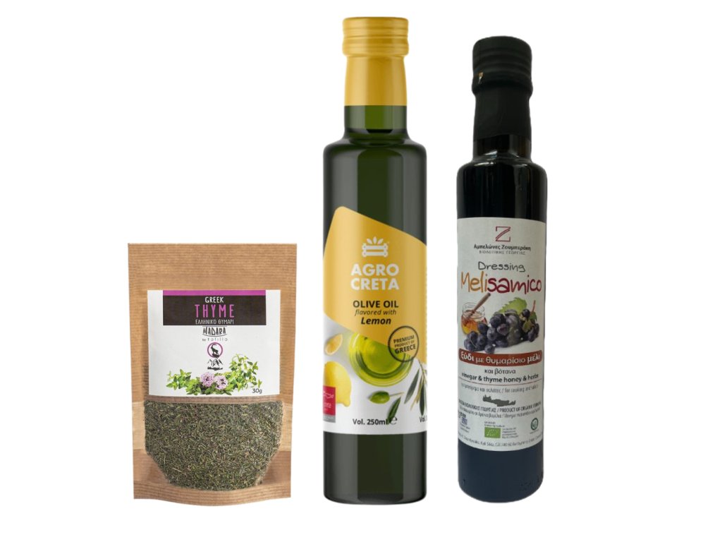 Středomořský set: citronový extra panenský olivový olej Agrocreta, krétský tymián Tofillo a octový dresing Zoumberakis s tymiánovým medem a bylinkami.