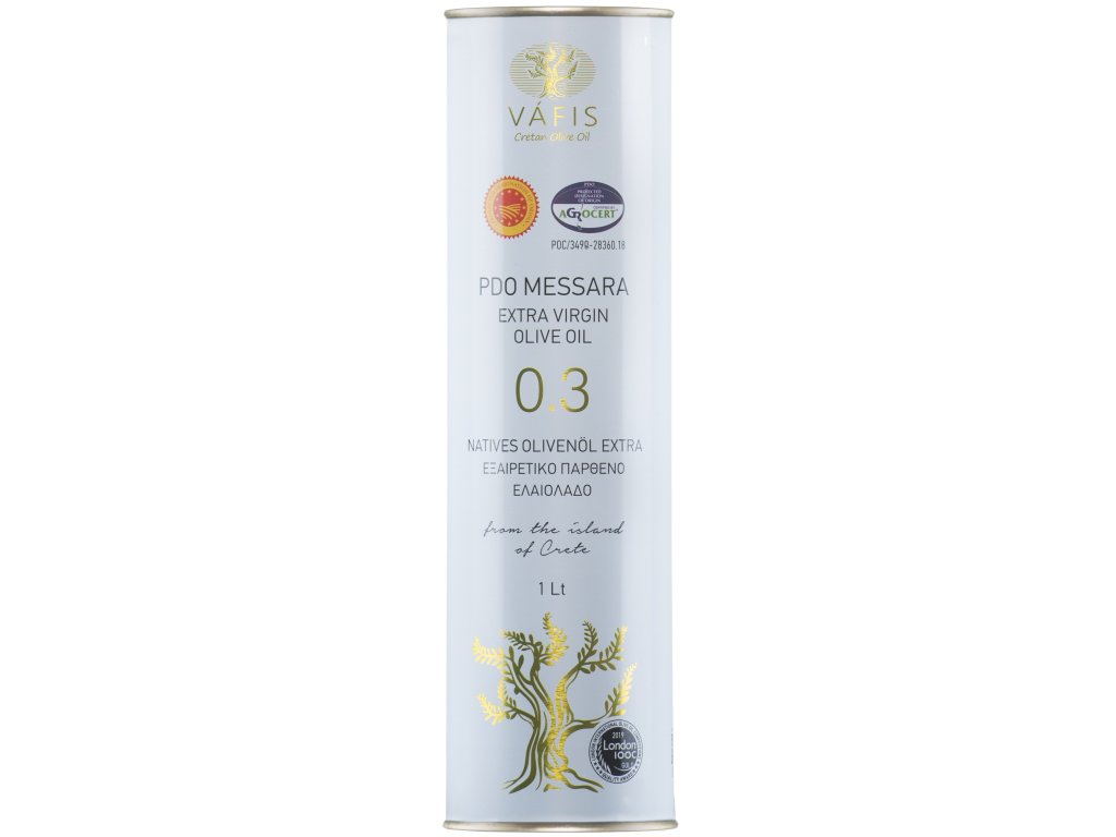 Řecký extra panenský olivový olej Vafis z oblasti Messara (P.D.O.) v praktickém plechovém balení 1 l. Nízká kyselost 0,3 %, intenzivní ovocná chuť, lisovaný za studena.