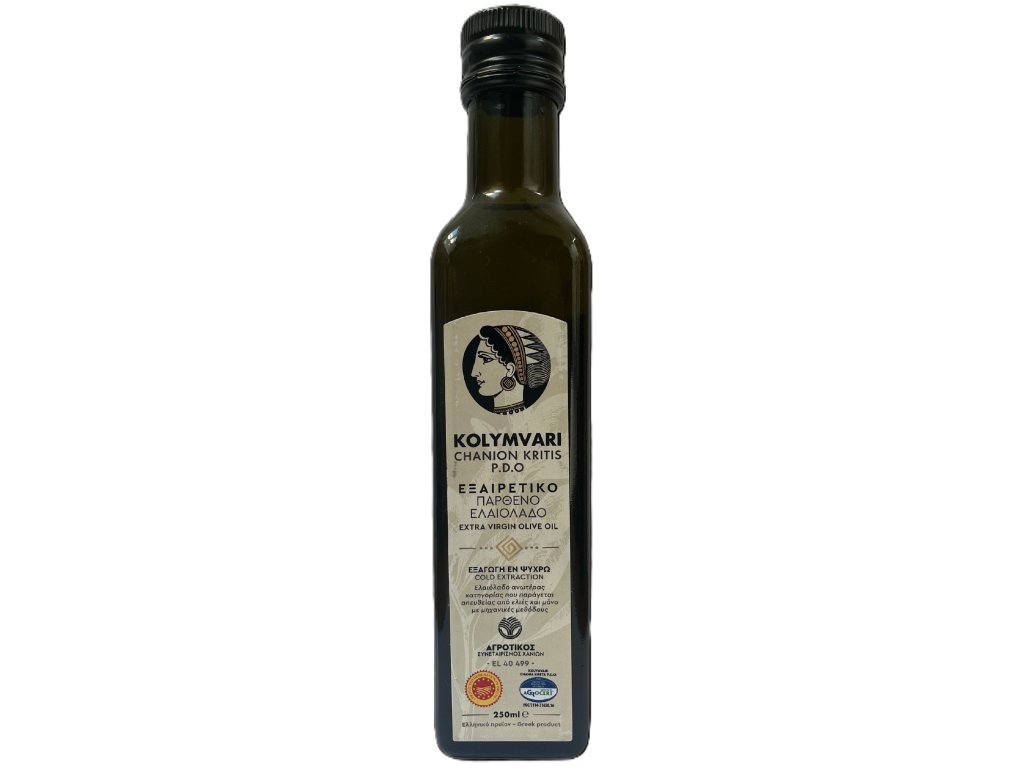 Prémiový extra panenský olivový olej Kolymbari s chráněným označením původu (P.D.O.) v praktické 250ml skleněné láhvi. Ideální na saláty, pizzu i k pečivu.