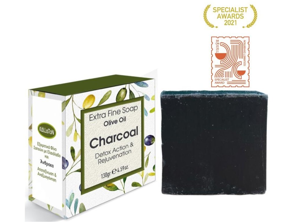 Přírodní mýdlo Kalliston 130 g s olivovým olejem, kokosovým olejem a aktivním uhlím. Jemně čistí, detoxikuje a chrání pokožku před vysoušením. Vhodné pro každodenní použití.