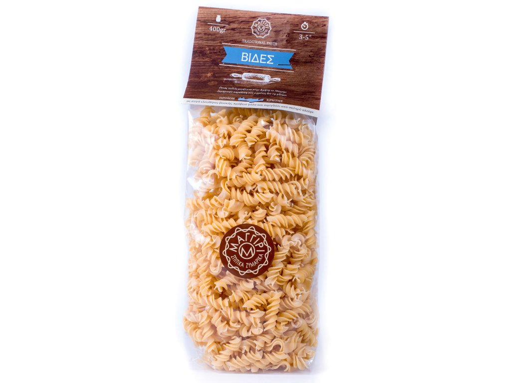 Ručně vyráběné fusilli Maggiri z Kréty, připravené z kvalitní semoliny, vajec a mléka. Tradiční těstovina se spirálovitým tvarem, ideální s rajčatovými omáčkami, sýrem feta nebo Graviéra.