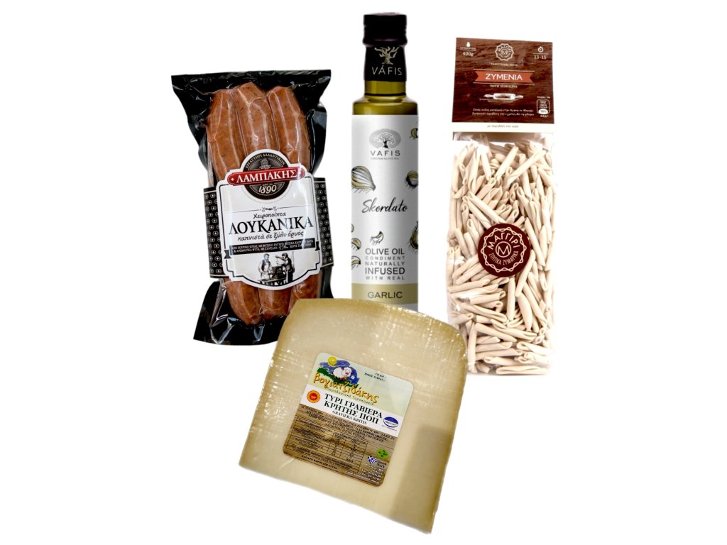 Balíček VAŘÍME S KRÉTOU spojuje tradiční těstoviny Zimenia, poctivé vepřové klobásky z Rethymnu, krétský sýr Graviera a extra panenský olivový olej s česnekem. Ideální základ pro rychlý, sytý a chutný oběd v krétském stylu.