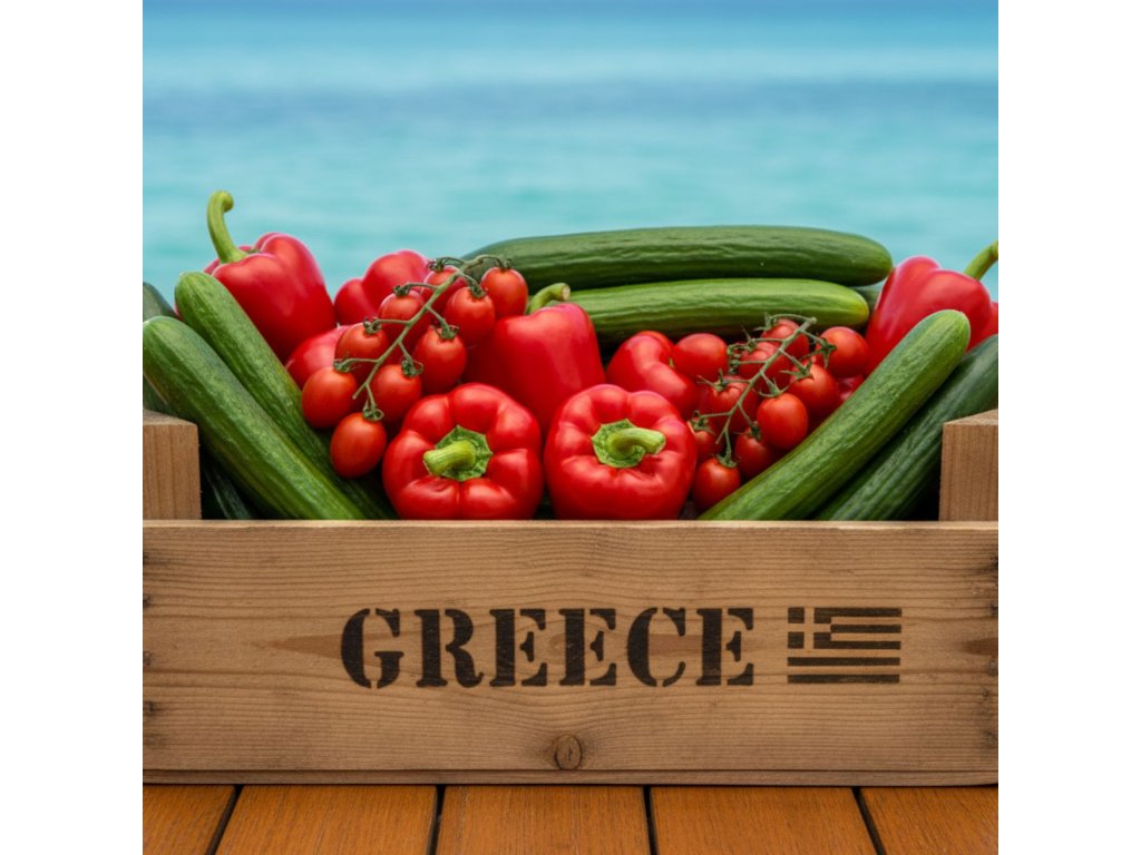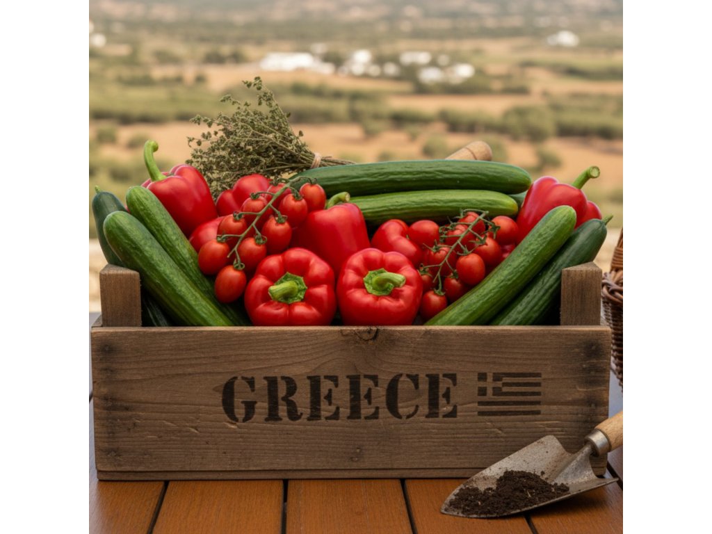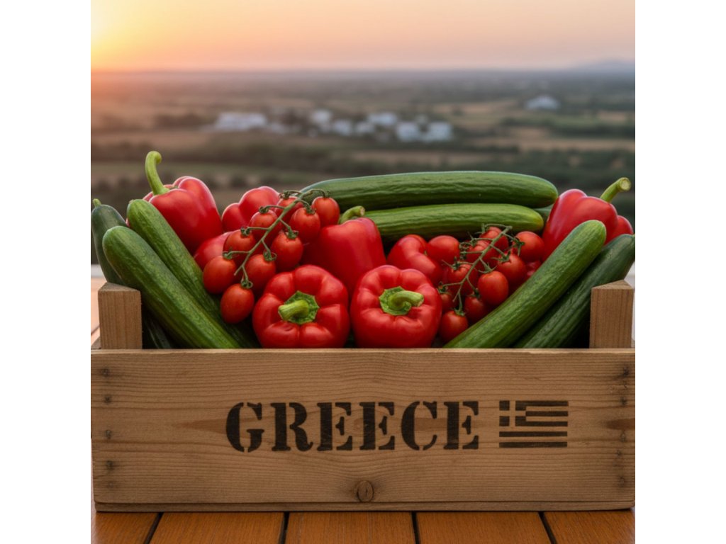 Bedýnka čerstvé zeleniny z Kréty o hmotnosti 7 kg – sladká rajčátka, křupavé papriky a osvěžující okurky. Pěstováno ekologicky, bez vosku, sklizeno těsně před cestou do ČR pro maximální čerstvost.