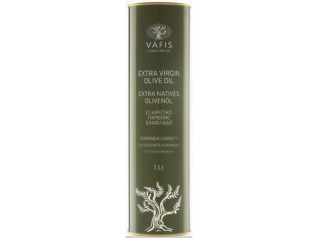 Řecký extra panenský olivový olej Vafis z odrůdy Koroneiki v plechovce 1 l. Lisovaný za studena, ovocná chuť a komplexní aroma. Praktické balení chrání olej před světlem.