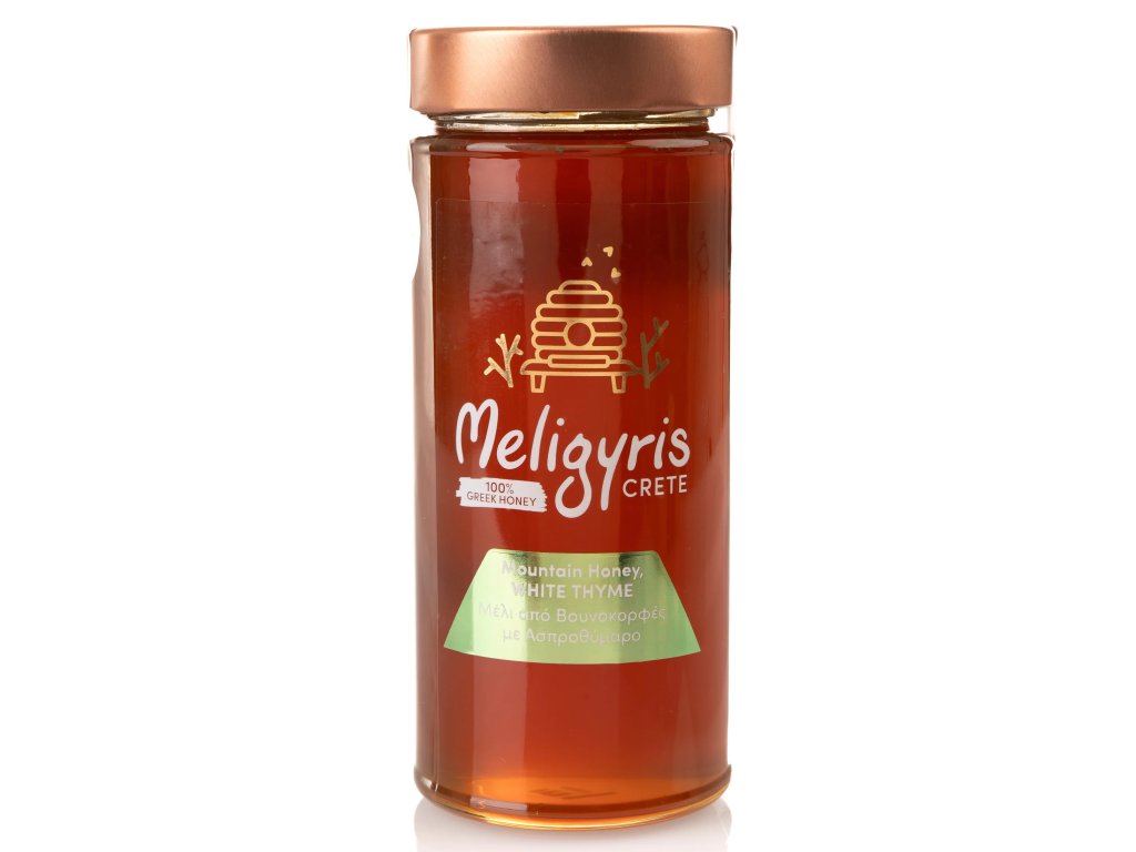 Horský med MELIGYRIS 800 g pochází z květů bílého tymiánu, který roste v extrémních podmínkách vysokohorských oblastí Kréty, nad hranicí 1500 m n. m. Tady panuje suché a teplé klima s nízkou vlhkostí vzduchu, které dává vzniknout medu s výjimečnými vlastnostmi – je hustší, aromatičtější a chuťově intenzivnější než běžné druhy tymiánového medu.